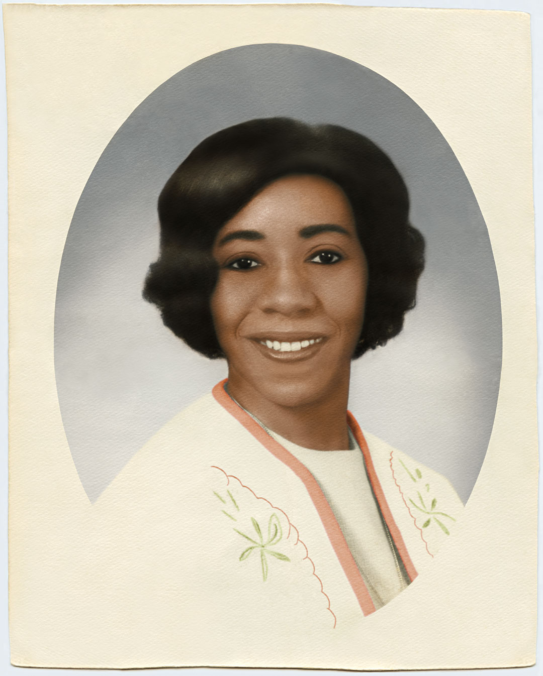 Restored photo by removing cracks, blemishes, and pencil marking . Below it is shown with retouching of hair and teeth. Also fixed missing edges of photo. Colorization was also added.